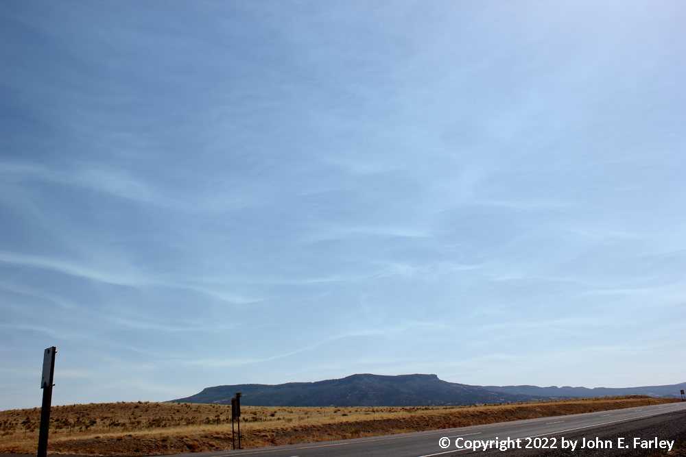 10:30 a.m. MDT - I headed out from Raton, NM on U.S. 64 toward Clayton. Preliminary target was an area bounded by Clayton, NM, Dalhart, TX, and Logan, NM. I would be able to shift east or southeast as needed, but initiation was expected to occur in NM. As I leave Raton, in the sky I can see smoke whisps from the fires in the Sangre de Cristo Mountains, taking on this appearance because of waves in the wind blowing the smoke, likely induced by the wind blowing over the mountains.