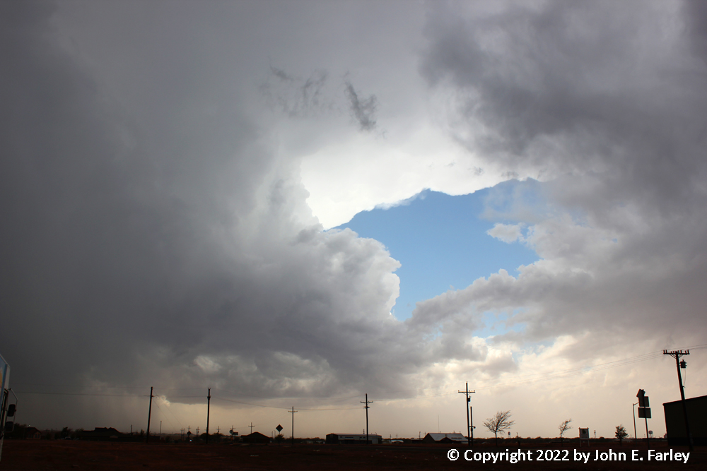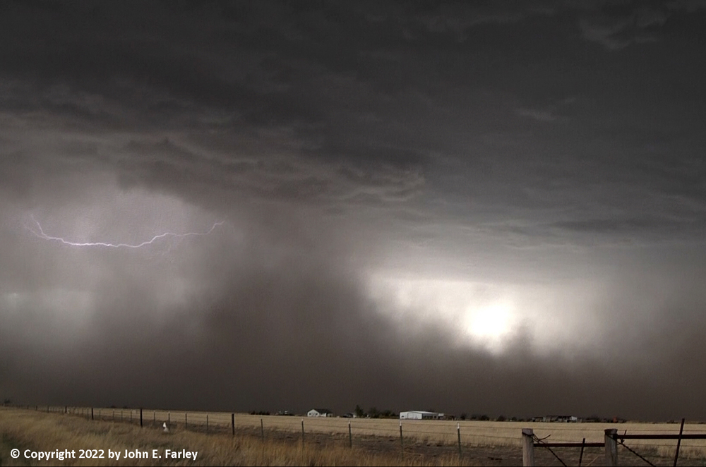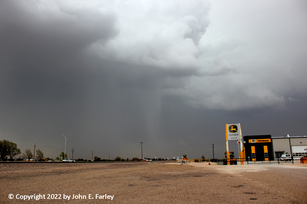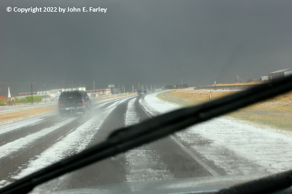 Meanwhile, golfball hail reports continue in the core of the storm to my north. I stay ahead of the storm east from here to Stinnet, watching the intense, dusty inflow at occasional stops ahead of the storm. 2 or 3 times as the storm gets closer, I get a few 1/3-1/2 inch hailstones, and shift east to get out of that.