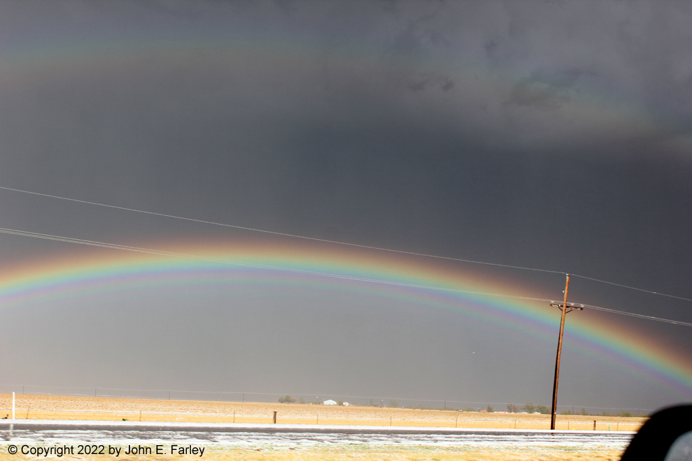 5:40 CDT - On 87 near the southeast edge of Dalhart, I encounter hail accumulation on the road and in the fields, with a spectacular double rainbow to my east. Here are a couple pictures: