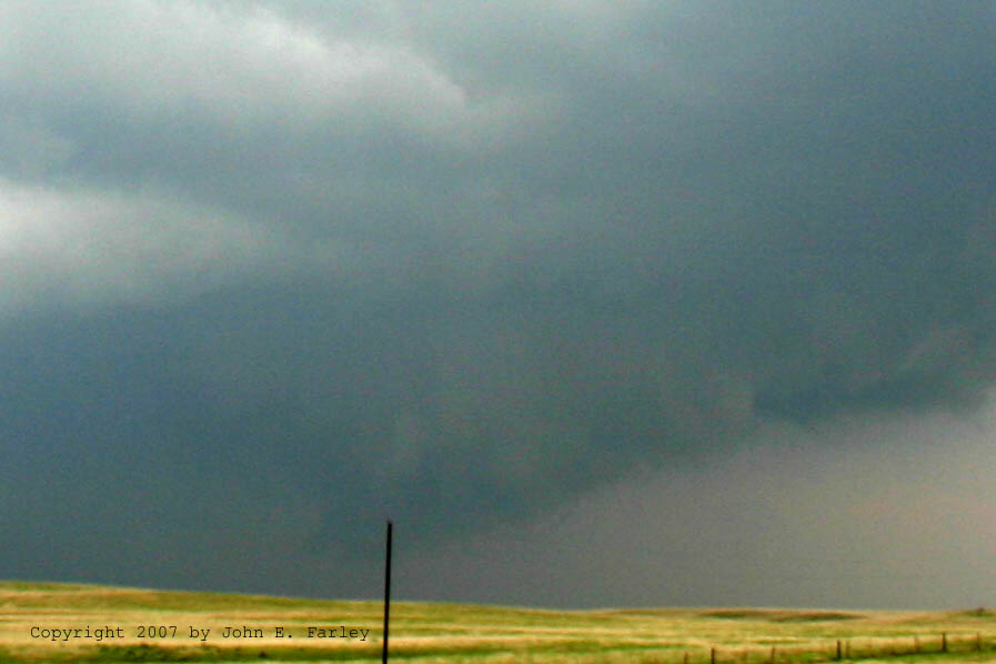 As I got to where the paved road turns west, about 6 miles north of Protection and 8 or 9 miles WNW of Coldwater, I faced confusion along with lots of other chasers. The road north was too muddy to continue - lots of abrupt stops by those who started into it, and going west or back south meant losing the storm. Just then, a tornado was reported by a chaser about 5 miles west of Coldwater at 6:35 p.m. This would have put it about 3 miles east of my location. I saw nothing that I could confirm as a tornado, and I have seen no reports from chasers in this area that definitively report seeing a tornado, though some said "possible tornado." After reviewing my photos, I will say the same, as I found an interesting feature in this picture. Look at the low spot in the tree line on the right-hand side of the picture - there is something there that COULD be a tornado or funnel cloud, and it would have been pretty close to the right place - a few miles to my ENE somewhere around 6:40. If anyone reading this can confirm that a tornado definitely did occur west of Coldwater around 6:35, please email me.