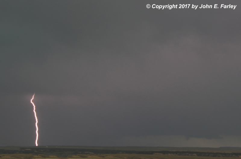 By the time I got a little past where these pictures were taken, the roads had become totally undrivable. They were bad enough even dry, very soft steep edges that already had nearly gotten me in the ditch once. But now wet, they were pretty much undrivable at any speed. I am sure that without AWD I would have been either stuck or in the ditch, and even with AWD I was fishtailing even at 10 or 15 miles an hour. And the storm was moving away from me a lot faster than I could drive on these roads, so I knew it was time to let it go and try to catch something else coming up from the south. So around 3:30 I reversed course and headed back south and west. There were SVR warned storms approaching Colorado Springs and also farther SE near Kim, so I figured I could work my way between those storms, which were moving north, and see what I could see. East of Colorado Springs I stopped to photograph some lightning, but that storm seemed to be weakening, so I returned to I-25 by the same route I had used earlier, passing east of Colorado Springs and rejoining 25 at Fountain to head south.