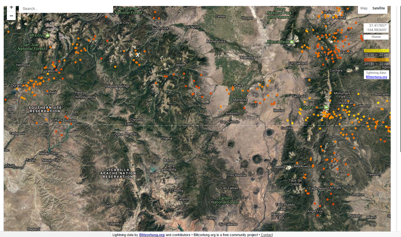 Here is a lightning map I downloaded when I got home. This shows all the lightning strikes that occurred in the previous 2 hours. Notice a general east-to-west pattern of strikes west-northwestward across the San Juan Mountains, with a number of strikes near Wolf Creek Pass, again indicated by the white X: