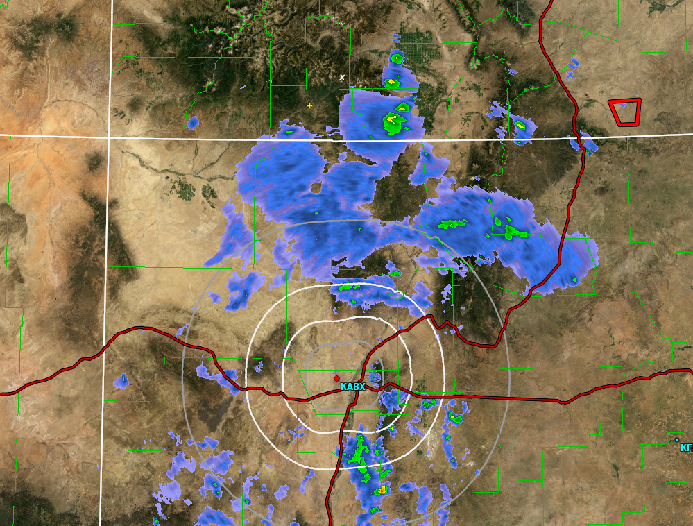 Here is a radar image from around 2:15. The X near the top center marks the location of Wolf Creek Pass. Note the broken line of convective precipitation (thunderstorms) to the east of the pass. These were moving toward the west.