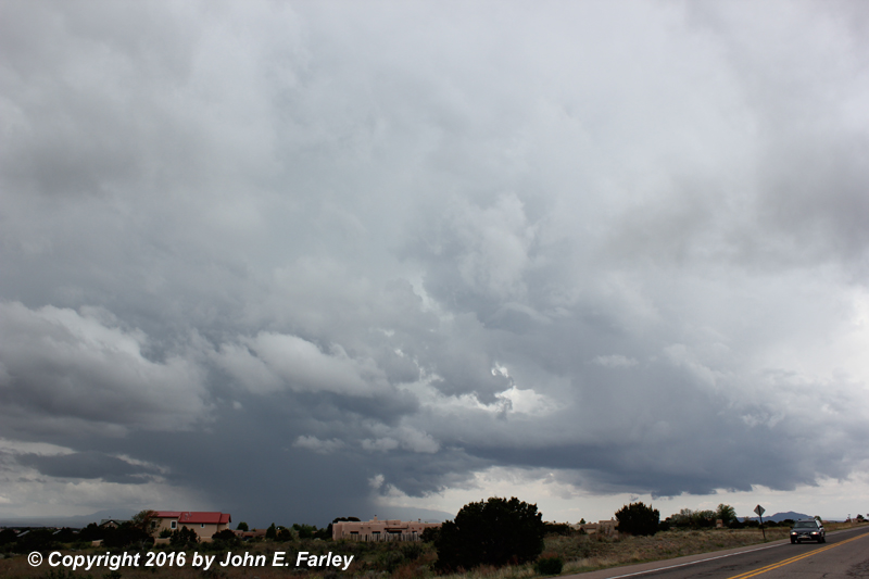 This would be the first of two days of severe storm observation for me, starting today in NM then shifting farther east the next day to somewhere likely in the TX/OK Panhandles. I decided to watch for a while, since I was starting out from Santa Fe and figured I might not need to go very far. By around 11, storms were forming over the mountains east of Santa Fe and northeast of Albuquerque, so I figured it was time to head out. The first storm I went after was near Galesteo, and it had a hail marker on radar and looked pretty good both visually and on radar. A picture can be seen here.
