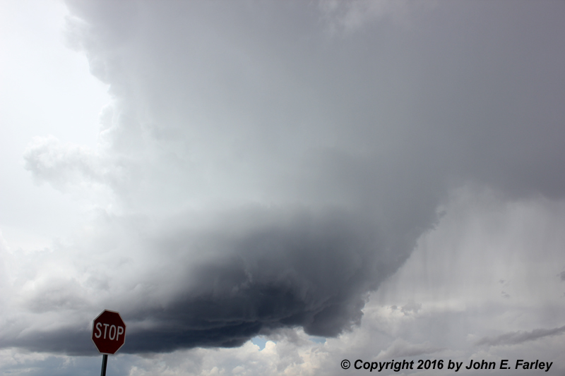This only shows the bottom part of the storm - I was too close to get the whole thing in. Hopefully at some point I will be able to do a panorama stitch to show the whole thing, and will add that to this report if and when I do. I watched the storm until it had crossed the highway, then started south toward I-25 to try to re-position for another intercept. But in the rear view mirrors I noticed it was forming a wall cloud, so I backtracked and soon was looking at this: