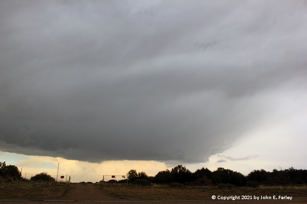 I continued through Branson and up the mesa into NM. About 3 miles in, I came to a place with open fields and a fairly clear view of the now very-impressive meso. The bottom was blocked by the highest part of the mesa, but considering that I was in wooded, mountainous terrain, this spot had an amazingly good view, and still an internet connection, too. The meso tightened up and extended to somewhere lower than I could see over the mesa - for a short time I thought it had something of the look of a tornado, but that did not last long, and in any case I could not see the lowest part of it due to the mesa - but what I could see looked impressive: