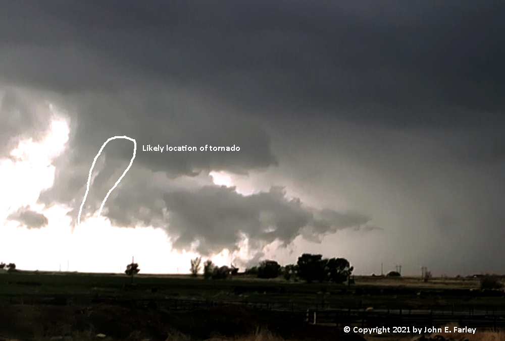 Could have been quite a view if the scud had not largely blocked the view, but I will not complain when I even briefly saw the only tornado in Colorado and one of only two reported in the United States on this day. Honestly, I would never have thought this was a tornado and did not think so at the time, but after seeing that there was a ground circulation and that it occurred right in the direction where I was looking, there is no doubt it was and that I saw at least part of it.