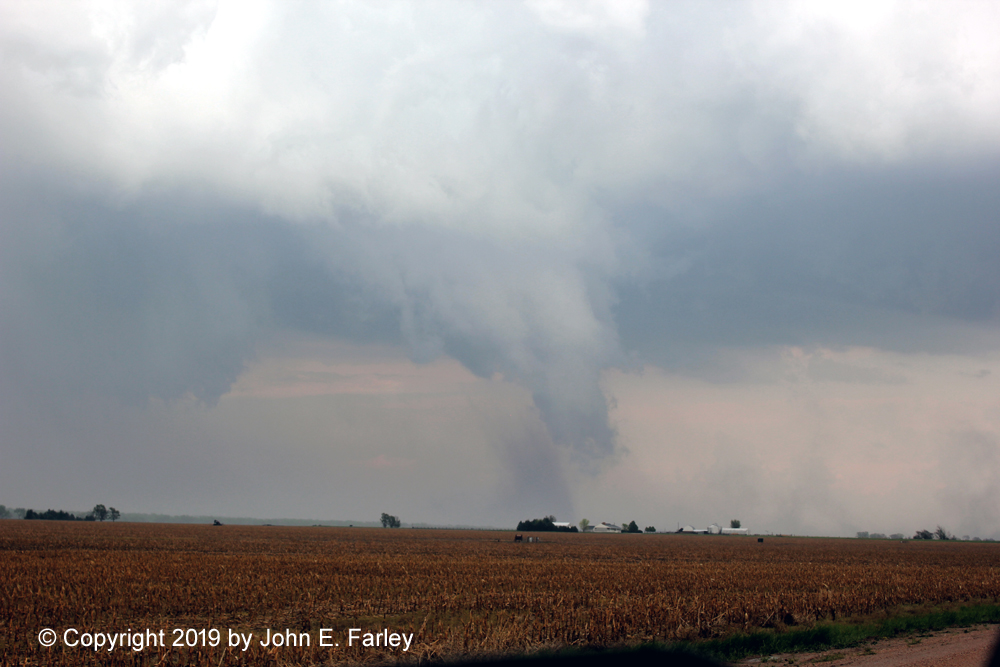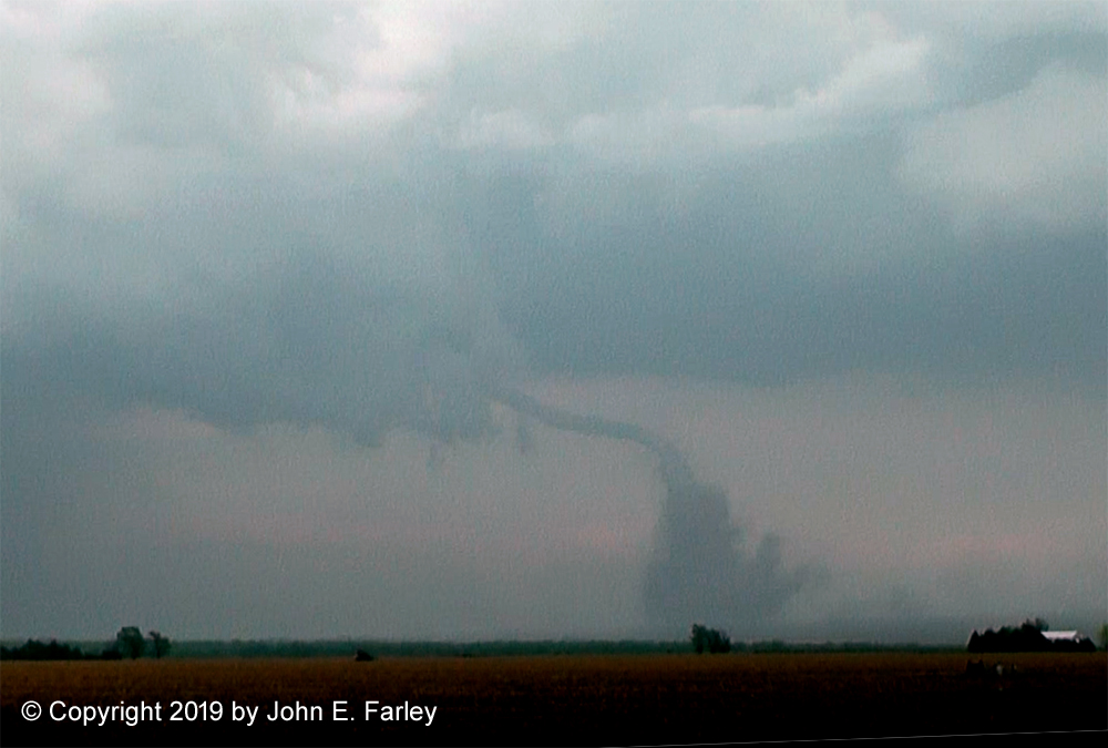 During the ropeout stage the condensation funnel became very narrow and horizontally stretched out, but the dust swirl actually became bigger. It was likely at some point during its ropeout that the tornado caused the most serious damage, hitting a farm and destroying a number of structures and severely damaging the farmhouse. Fortunately the couple who lived in the house knew well where the safest place in the house was, and went to the one room that remained fully intact, thus avoiding injury. Here are a couple video captures of the tornado in the ropeout stage: