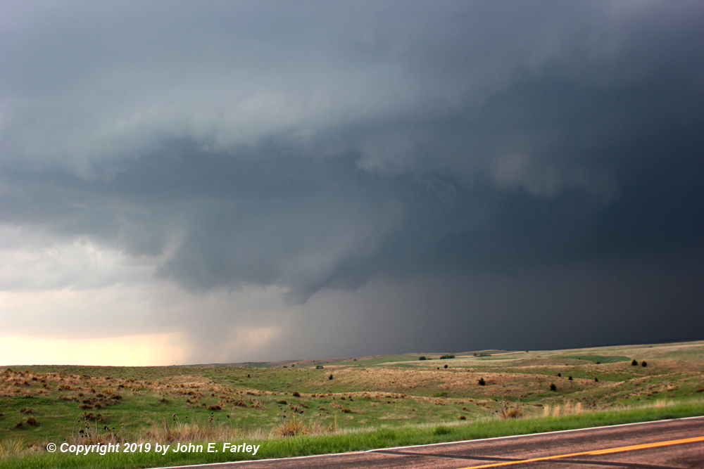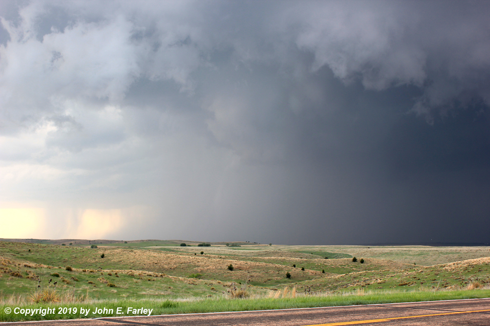 I watched the storm for quite some time from this position (in hindsight, probably a little too long). Eventually I knew I needed to stairstep east and north to re-intercept it. Going north form Atwood was not an option because the storm was about to cross that road with its large hail. So I went back to Oberlin and then back north toward Culbertson on route 17.