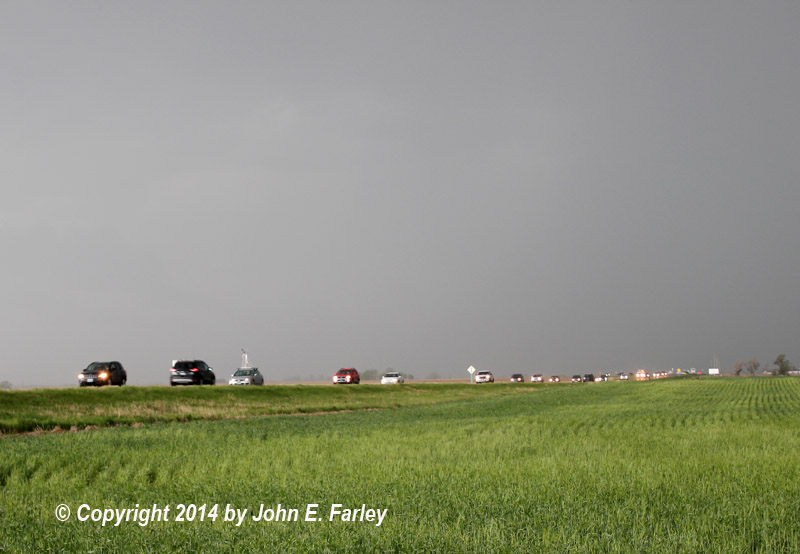 4:08 - I am stuck in a line of chase vehicles trying to turn left into massive chaser traffic on U.S. 36. I nearly get cored by the rain and hail in the hook/wet RFD before I finally get into the traffic and head east, with occasional slowdowns due to the heavy traffic. Here is a picture of the traffic, with the precipitation in the hook rapidly approaching in the background: