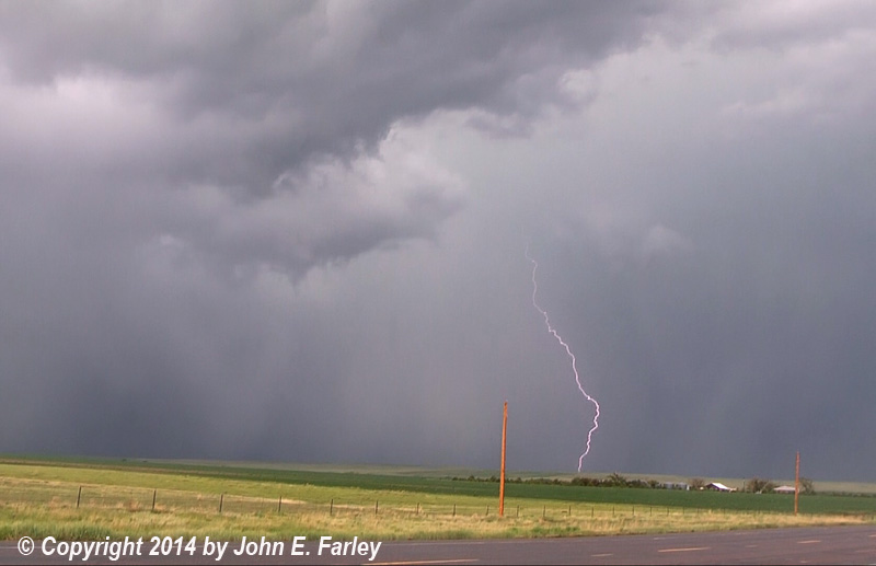 5:15-5:30 - Now the storms are lining out, as a line of thunderstorms rapidly forms extending east then southeast from the original supercell. I get caught in a lot of small hail from a new cell that formed almost over me along the line SE from the original storm. This was at the Washington Co. line, west of Last Chance. After the hail passes, I stay for a while and video/photograph the hail shafts and lightning to my NE: