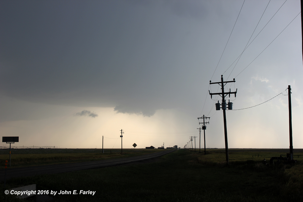 By a little after 7:00 CDT, I was due east of the lead storm, which at this time was the stronger of the two, at the intersection of U.S. 385 and TX Farm Road 1062, between Vega and Hereford.  The lead storm had formed a small wall cloud; here is how it looked as it dropped 2-inch hail just east of Simms, a few miles to my WNW: