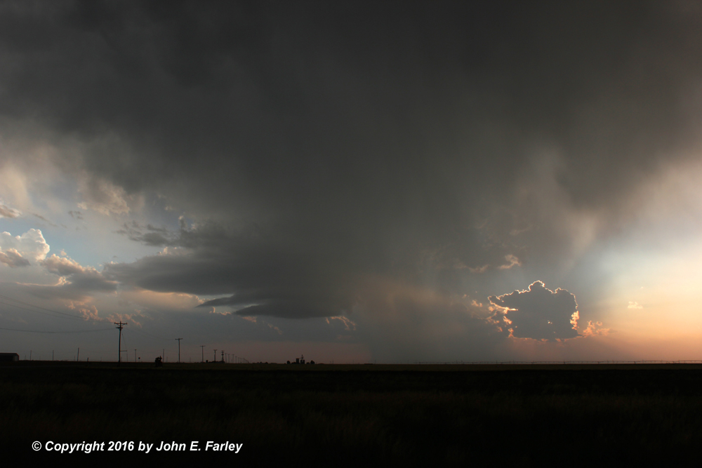 A wider-angle picture showing both the lead and trailing storms at this time can be seen here.  After a while the lead storm weakened, the trailing storm strenghtened, and the two gradually merged into one.  The storms had been rather LP all along, but after the merger this became more clearly the case, and the lowering sun gave the storm more and more color.  As this LP supercell moved over the Simms, TX area as the earlier one had done, it really looked more pretty than menacing. However, it continued to drop hail of gradually increasing size.  It was dropping 1-inch hail when I took this picture around 8:20 p.m. from along route 1062 between route 385 and Canyon, looking west: