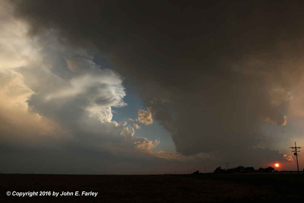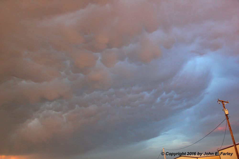 Fortunately, I easily managed to stay ahead of the slow-moving storm, and stayed entirely out of the hail.  I gradually drifted east toward Canyon ahead of the storm, stopping again where 1062 runs into U.S. 60 for some final pictures at sunset of the storm (which was now beginning to weaken) along with another more distant one to its south, and also some beautiful, partially sunlit mammatus in the anvil of the storm I had been chasing, which now extended across the sky to the eastern horizon: