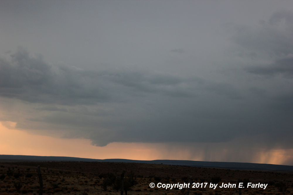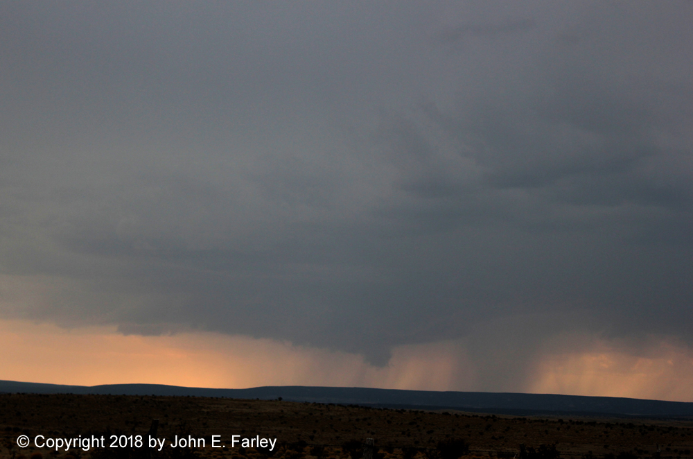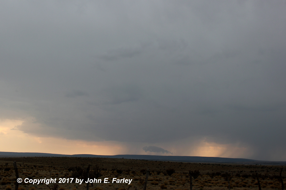 After getting this picture, I bailed southeast as the RFD blasted me with dust and tumbleweeds. Probably sub-severe wind, perhaps in the 40-50 mph range, though it may have been stronger in nearby areas where big dust clouds were kicked up. While watching the storm and as I was bailing southeast on 55, 3 pronghorn (first one, then later two more) crossed the road right in front of me. They seemed freaked out by the storm; one ran right in front of me. The first one dug under the fence rather than jumping over (they can jump fences, but don't like to); amazing how fast it got under the fence.