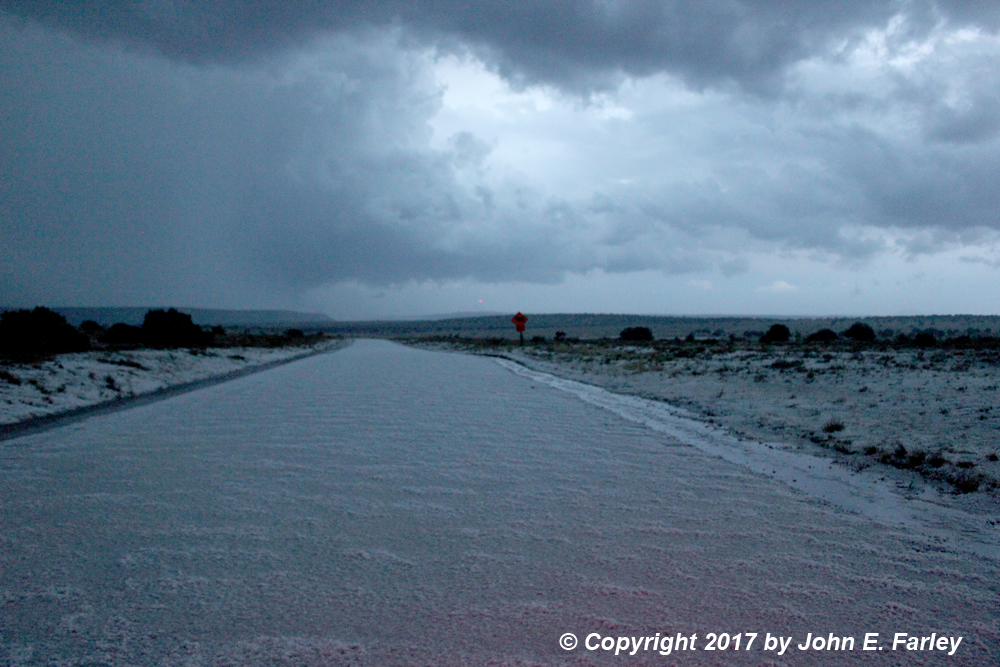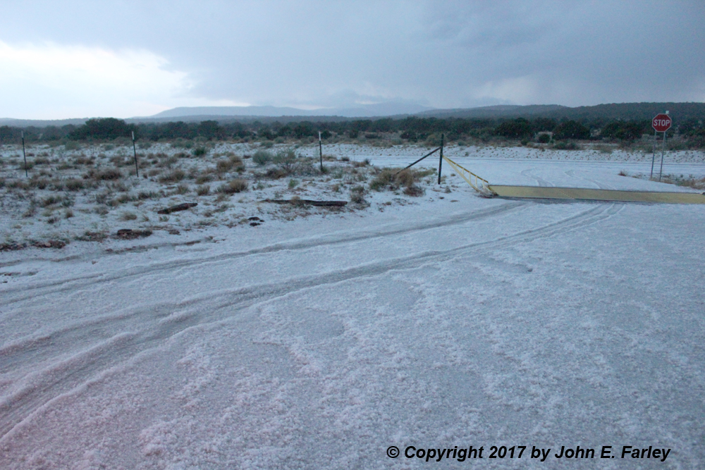 In the second picture, you can see the storm retreating to the east in the background, looking down a side road that nobody has ventured down since the storm. The biggest stone I saw here was about nickel size, but since it was still raining quite a bit, I did not spend a lot of time looking around for hail sizes. This was about 4-5 miles SW of Corona; others reported hail an inch in diameter there, and as large as 1.25" closer to Corona. There were also reports of hail accumulations of 3-6 inches along 54, but it did not look that deep to me.