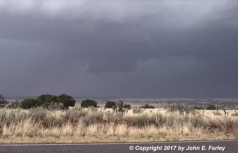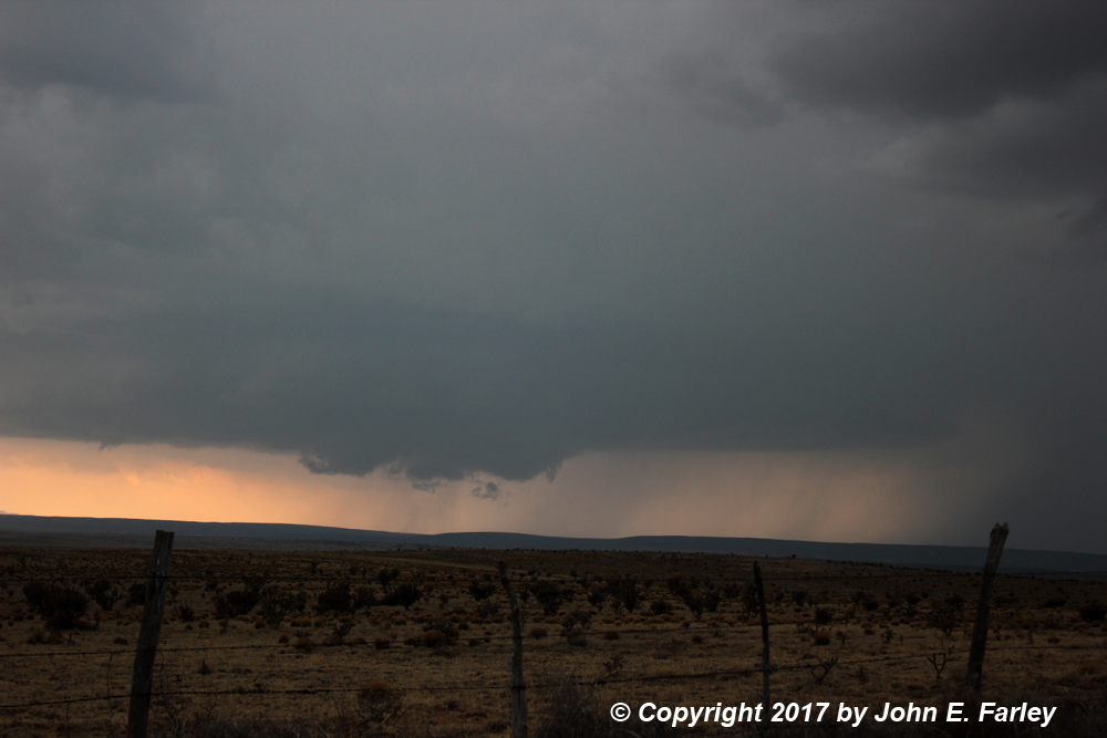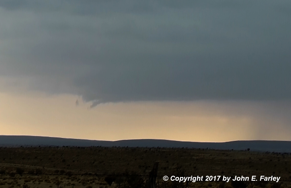 Anyway, at 4:30 I decided to cut my losses on the Ruidoso/Lincoln junk and head for the main line of storms. (There was, later, a nice supercell in that area, but not until an hour or so before sunset, and that area is mountainous and hard to chase, so I do not regret my choice). Now there were some strong storms, rather isolated, about 40 miles to the WNW of Carrizozo. They were near highway 380 that crosses the mountains west of Carrizozo, but I figured if I went that way, the storms would move NE away from me and I would be stuck with no way to follow them. So I went northeast on route 54 instead, figuring to cut northwest from there to intercept the storms. The road to Claunch and Gran Quivira, NM route 55, looked like it would get me closer to these storms, so I took that. This would be somwhere around 5 p.m. I thought the storms would drift slowly to tne NNE and pass west of Gran Quivira based on how they had been moving, but there was eventually a rightward turn that allowed me a much closer intercept. By around 5:15, the main line, to the NNE of the cluster of storms I was interested in, got SVR warned, and my road afforded a view of both that line to my N and NE and the cluster of storms I was interested in, to my SW. Data was intermittent, but when I had it, the radar appeared to show the storms to my SW intensifying. I stopped several times south of Claunch between 5:15 and 5:40 or so, watching and photographing both the SVR-warned line to my NNE and the approaching more isolated storms to my SW. From around 5:45 through 6:45 I made a number of stops at the west edge of Claunch, a few miles north of there, and a few miles south of there, as the storms congealed into one strong supercell. Around 5:50, by which time a special weather statement has been issued for the storm, a large scud cloud formed near the ground under the updraft. This merged into the base of the cloud and became a wall cloud by 6:00 p.m.: