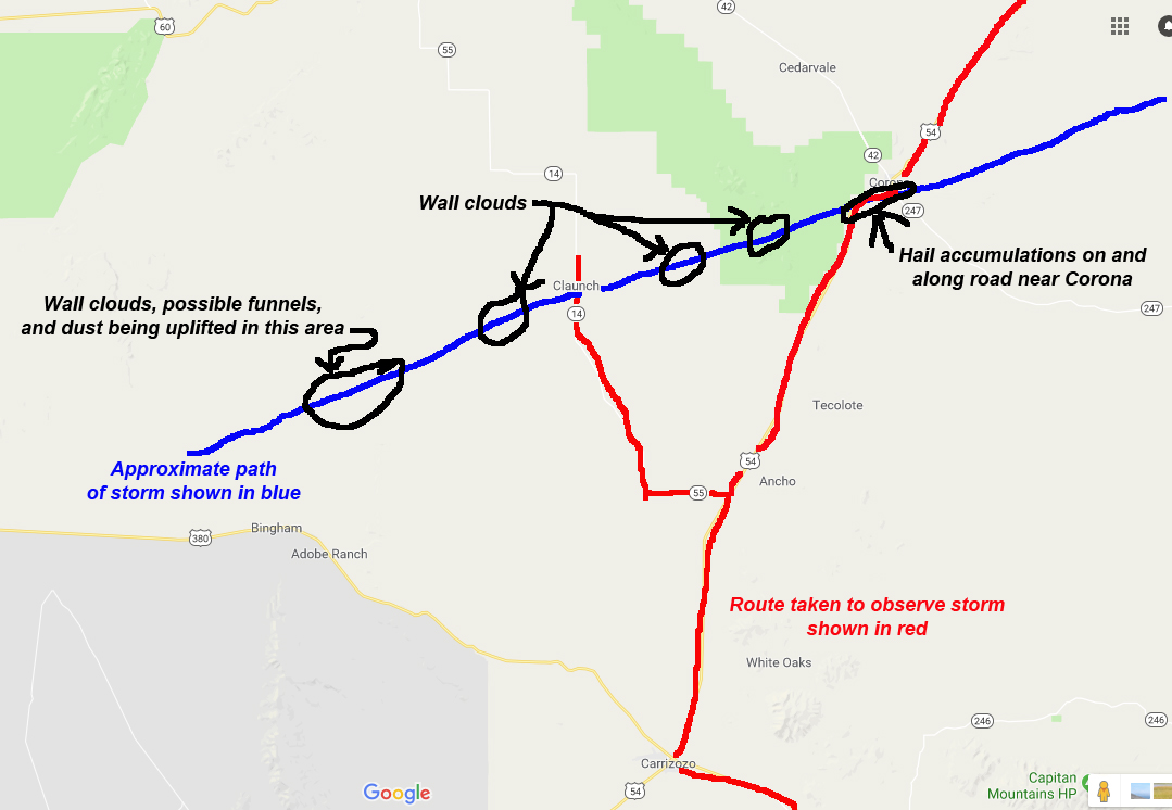 I was out the door from Santa Fe at 10:10 a.m. with a target of somewhere around Roswell. I ended up getting there around 2:00, but realized by then I needed to be at least a little west of there for where I expected storms to fire. The HRRR still showed storms firing soon around Ruidoso/Lincoln. Up to now, all the substantial storms were west of the central mountains, with a number of SVR warnings there. Hail and flooding did occur with a SVR-warned storm in Albuquerque, and storms were starting to cross the mountains up there. But still west of the mountains where I was. I adjusted west to the hwy split between 70 to Ruidoso and 380 to Carrizozo and played around for a while with storms firing just west of there. This is where the HRRR predicted a big storm (and was consistent in that through many runs). But all the storms there were junk - a little tower would go up and immediately fall apart. Saw the Mississippi State University chase van in this area, similarly waiting and trying to decide what to do, I guess. After fooling around with these till a little after 3:30, I decided to move west toward Carrizozo. If anything went in this area while I was on the way there, I could get it, but I could also shift to the other storms if not. I watched both groups of storms until I got to Carrizozo around 4:30, still undecided. One storm to my south looked visually good around 4:20, and I thought about going after it. But it still looked poor on radar, and looked less good visually after a few minutes. Since the HRRR had predicted big storms in this area as early as 1:00 p.m. and nothing but junk had happened, I thought I should cut my losses. After all, there were strong storms now crossing the mountains west and north of my location. Also on the latest HRRR, nothing was predicted anywhere south of its predicted Ruidoso-area storm, and that was pretty much the southeastern end of the severe thunderstorm watch that had been in effect since around 1:00. Interestingly, SPC issued a mesoscale discussion when the storms initiated west of the mountains in the late morning, mentioning only a 20 percent of a watch in that area, with one more likely to the SE later. Then one was issued, pretty much for that discussion area, including Ruidoso and Carrizozo but not Roswell, and extending all the way up to the CO state line on the west side of the central mountains, including Albuquerque and Santa Fe. No more MDs were issued for NM after that until much later, while I was on my storm, mentioning a 20 percent chance of a watch to the east and south of the current one. Then less than an hour later, they issued a new watch there. Go figure - 2 for 2 on a 20 percent chance of a watch.