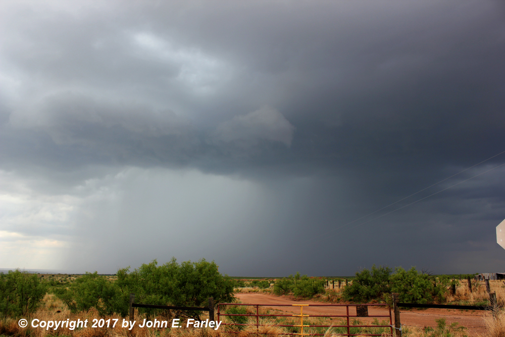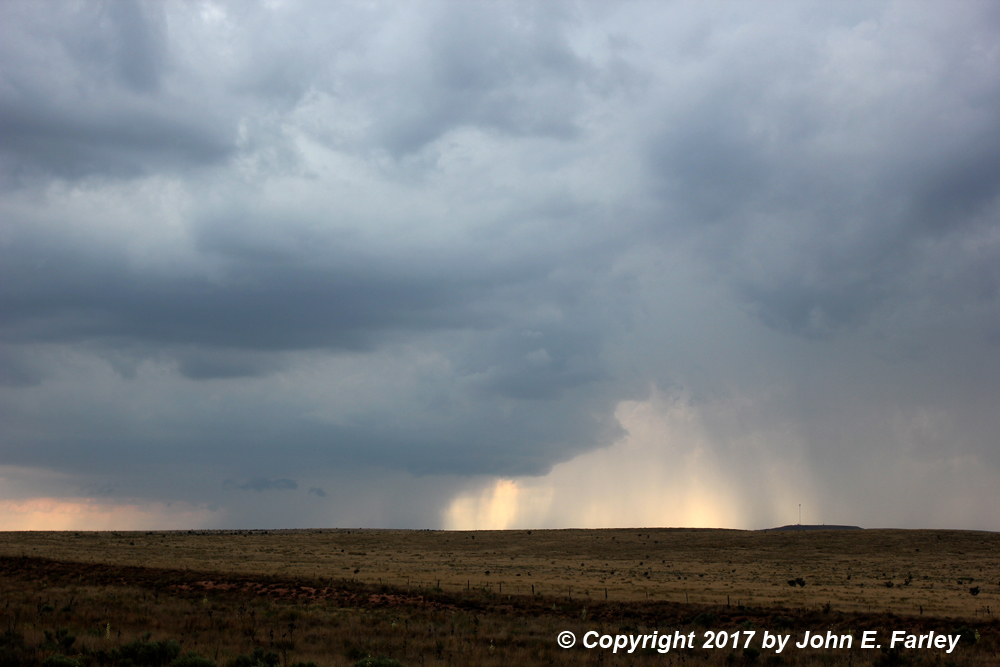 It was now around sunset, about 8 p.m., and too dark and I was too far away to tell exactly what this was. I think most likely it was a scud column, but there certainly could have been a transient funnel in there. I watched it for a minute or two and got a little video (from which the above picture is a capture) as I drove toward the canyon, but when I came up the other side, it was gone, with just a wide, slightly lowered area under the updraft left. I stopped there and watched the lightning show, along with a sunset through some rain to my northwest, for a while, before heading back into Logan to find lodging and dinner. This storm, combined with the earlier one, ended up dropping 2-4 inches of rain along route 54 and for a few miles both sides of it between Logan and Nara Visa.
