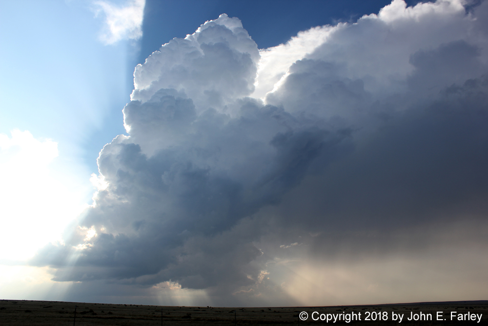 Kind of the appearance of half a mothership from this angle. I then went north a bit from Nara Visa, but the storm seemed to be weakening quickly. I then waffled back and forth between this storm and the Texas ones, as both areas of storms seemed to wane and wax for a while. Finally, somewhere around 5:15 or 5:30, I decided to commit to the NM storm, as it seemed to be holding its strength a little better and was more isolated. I headed north from Nara Visa on NM 402 then west and eventually north on back roads. The storm by this time was drifting very slowly to the north or even NNW, as its backbuilding to the west seemed to more than offset the weak northeastward steering currents. Along the back road, we had chaser convergence (the good kind), as I met Blaize Justice and had a nice visit with him about the storm, chasing, and (yes, believe it or not) northern pike fishing. After that I continued on and got some of my favorite pictures of the day, even as the storm was now clearly weakening. But with the sun behind it, the storm and its surroundings took on a spectacular appearance around 6:20 p.m.: