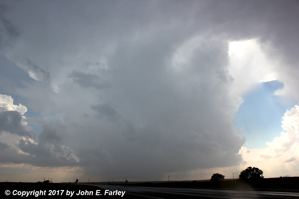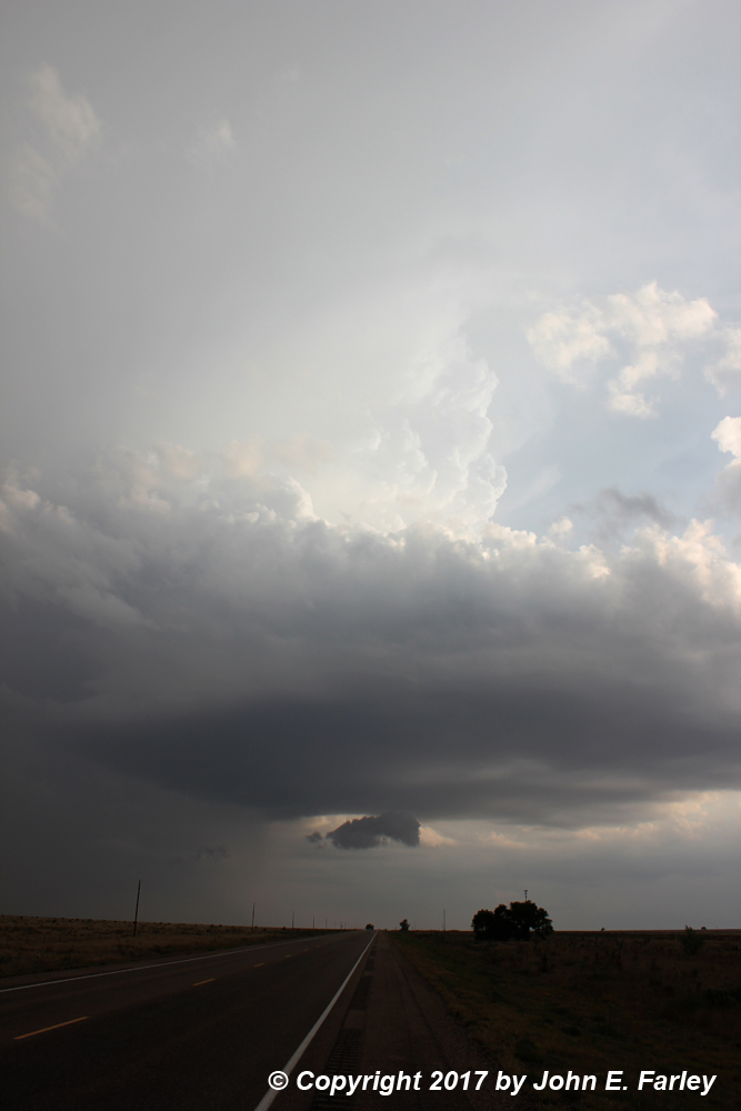 By around 6:30, it looked like the storm was dying out, so I decided to head back through Nara Visa to get lodging for the night in Logan. However, visually and on radar, it quickly became evident that one reason the storm had faded was that a new cluster of storms had exploded SE of route 54 between Logan and Nara Visa, not far from where the earlier storm had developed more than 3 hours earlier. These storms were putting down copious amounts of rain and hail south and SE of route 54. Most of this cluster of storms, now SVR-warned, was south of 54, but there was an updraft on the northern flank of the storms right over the highway between me and Logan. There was a rainfoot just south of the updraft that looked like it was just barely reaching the highway. A piece of rising scud formed right under the updraft ahead of me - here is a picture of the storm at this time: