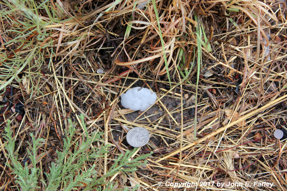 I continued to US 54, then went northeast on that route through Logan toward Nara Visa. A few miles out of Logan, with the storm now directly in front of me over 54, I began to notice hailstones on the road and on the ground near it. Somewhere around 5 miles NE of Logan and around 3:50 p.m., I stopped and photographed this stone, around 1.5" in diameter: