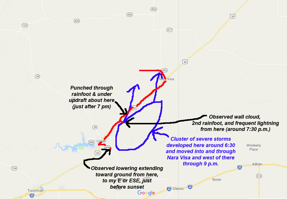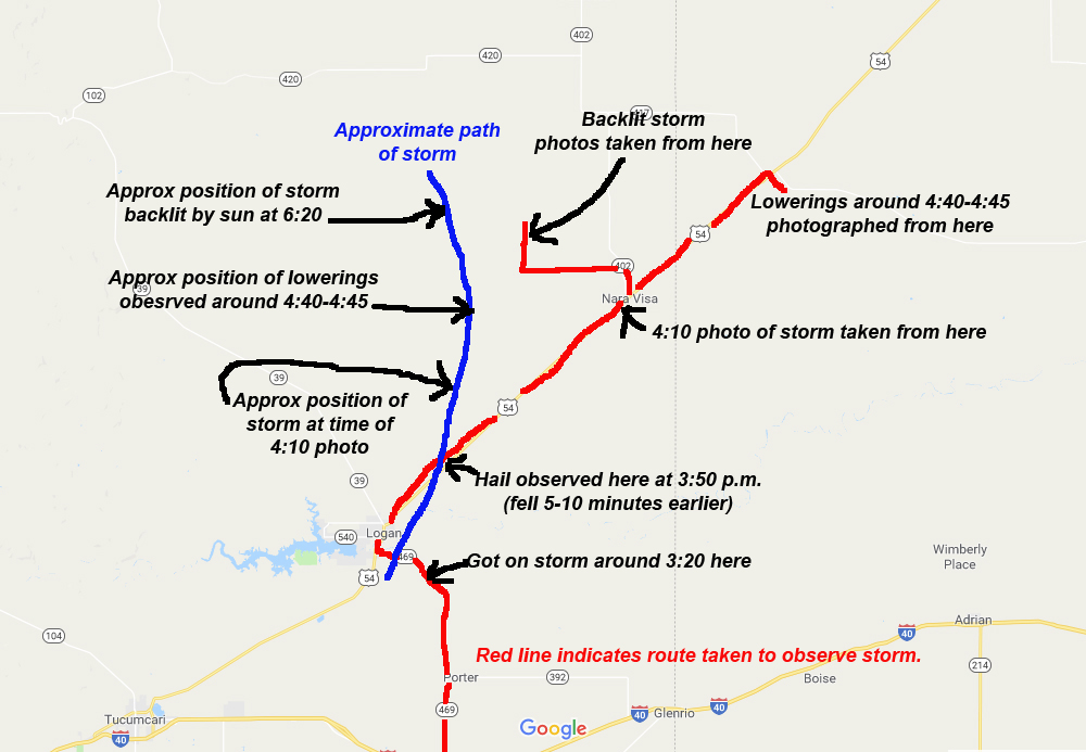Here is a map showing the track of this storm, the locations of the phenomena that I observed with it, and the locations from which I observed them. As mentioned, way too far away for the best lowerings, but it is what it is.
