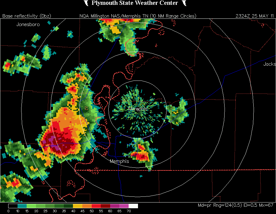 Edit - 6/3/11 - A damage survey by the NWS in West Memphis initially found that the damage in West Memphis was due to straight line winds. However, multiple videos have appeared on the Web showing a funnel cloud with clear rotation, and both a debris swirl on land (accompanied by power flashes and a damaged power pole) and a swirl of spray on a small body of water near the Mississippi River. Links to four videos can be found here. Additionally, a highly experienced and respected storm chasing tour group observed this event and indicated it was a tornado. Taking all this into consideration, there is no doubt in my mind that a weak tornado/waterspout occurred in West Memphis. The only question was whether it was strong enough to meet the criteria to be considered a tornado. But since one of the videos shows power flashes in the same place as the debris swirl and a power pole that was blown over (at 2:15 in Brandon Ivey's video, the second one listed on the video links page), I would think it likely that the criteria was met and that in fact an EF0 tornado occurred.