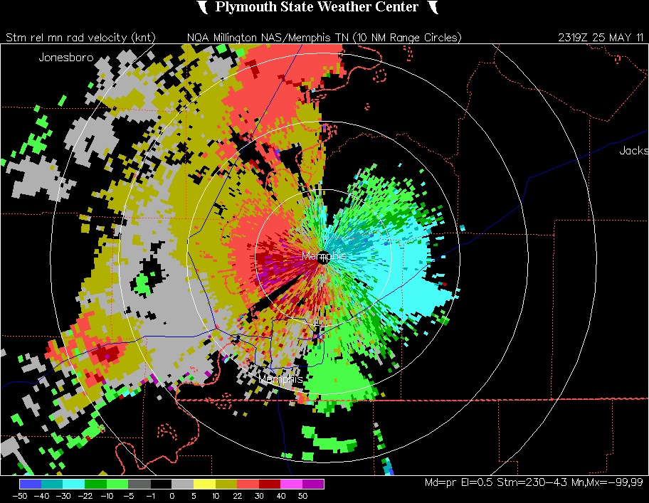 Storm-relative velocity image from the time of the first tornado - Note the adjacent red and green areas where the tornado occurred, as well as the very strong winds in the precipitation core.