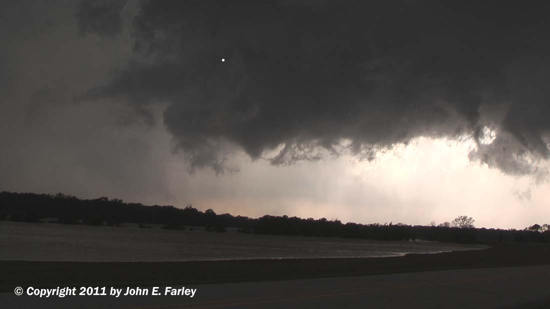I couldn't keep up with this storm so I blasted east on 64 then south from Parkin to intercept the next storm down the line, finally catching up just northwest of Greasy Corner or about 6 miles north of Hughes. I hit some fairly heavy rain but no hail by the time I reached I-40 at Shell Lake, where I jumped east one exit to get farther south, as the meso was tracking south of I-40. I stopped a mile or so northwest of Greasy Corner on routes 149 and 50. The storm, which had nice backlighting from that location, was cycling at the time and had two mesos - an older, quite rain-wrapped one to my southwest, and a new one just to my northwest.
