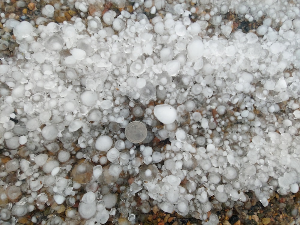 Since I was NW of the core of the storm, I turned south on state route 224 to try to get in position to catch up with the storm without driving into it. Shortly after where it jogs south, then east, then south again, I reached the hail swath around 6:20, where the ground was covered and I measured uo to quarter-sized hail.