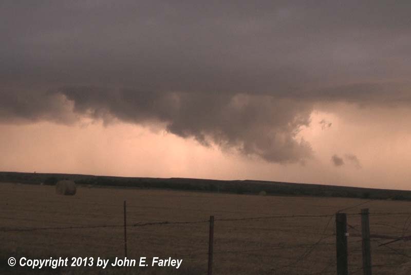 After a few minutes, it appeared that the circulation that produced the tornado was occluding and the lowering closer to me was becoming the primary meso. A picture from around that time can be seen here. It's possible the tornado could still have been going on in the rain back there under the occluding meso, but shortly after this time the more distant feature dissipated and the one in the foreground became dominant. This new circulation was moving directly toward me or even might pass to my south, but was not moving real fast. Here is a video capture of it that I got before I made an eastward adjustment from the same place as the captures above were obtained: