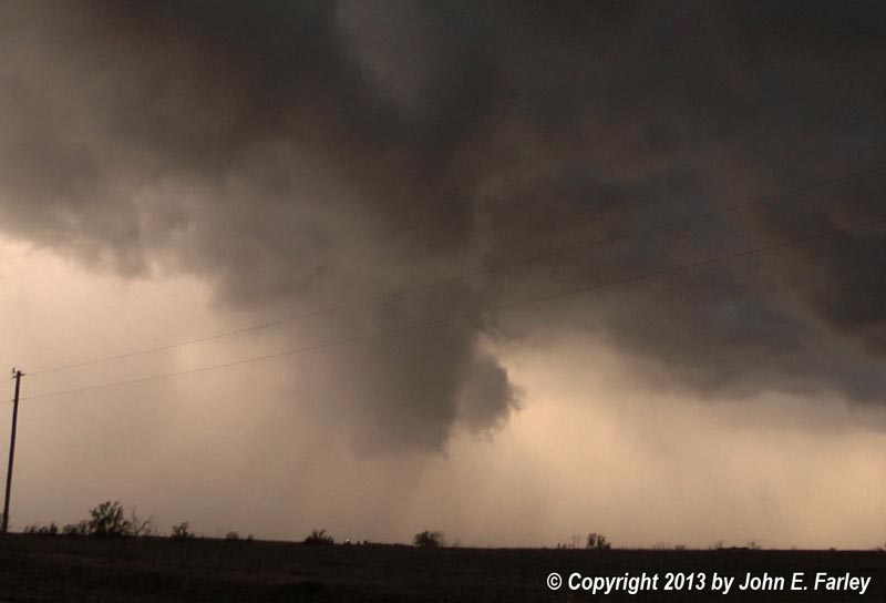 By the time I had eaten a quick lunch in Laverne, storms were starting to fire just to the west along the OK/TX panhandle border - but didn't really seem able to get organized, firing and quickly dissipating, and somewhat getting sheared apart by the strong upper winds from the south. A stronger supercell and later, a line with embedded supercells, formed well west in the TX Panhandle - farther west than I expected, and also well to my south, with some of the storms trailing back across I-40. It turns out that the dryline was farther west than I expected at initiation, so I should have started out even farther west than I did. I waited a while to see if the closer storms would intensify, while watching the ones well to my west and southwest in the Texas Panhandle. I suffered from lots of indecision on this chase - more than most, for sure - and this was one of the times where I was most indecisive, starting west, north, south, etc. but never going very far as I changed my mind about what would be the best chase strategy or the best storm to go after. Then a very nice-looking storm fired not too far to my east, just west of Woodward. I went after it to the edge of Woodward, but it accellerated northward away from me and weakened. Turns out this was a poor choice anyway, because to get to Woodward I had to go south to Purcell from maybe 10 miles north of there before I could go northeast to Woodward. So even though this storm was not far to my east when it initiated, it was well to my northeast by the time I could go in that direction.