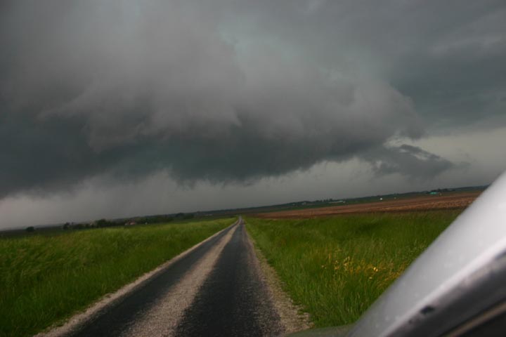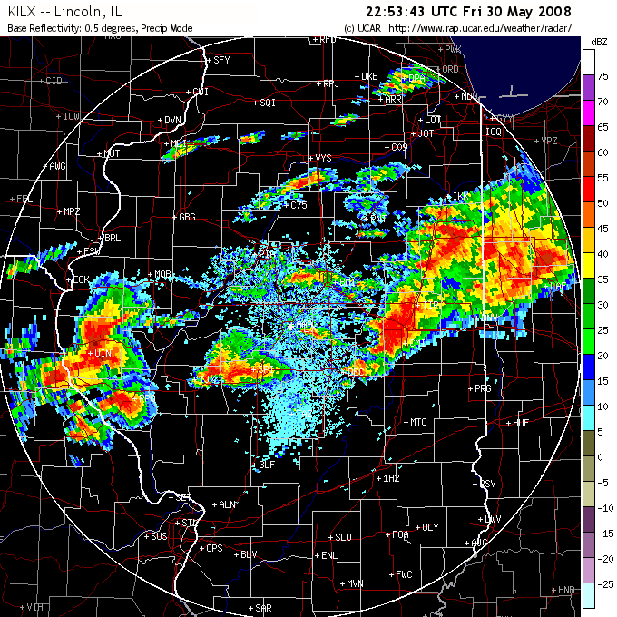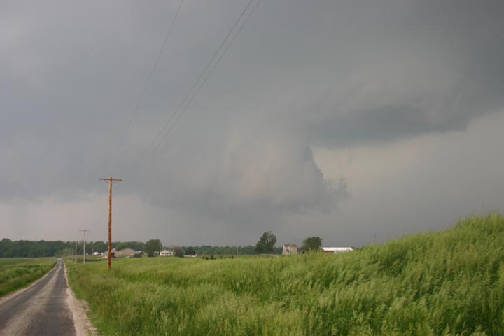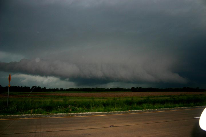 Soon thereafter, things got a bit more exciting. After the aforementioned bit of road confusion, I was about to give up the chase at my location a couple miles north of Woodson for lack of an east option. Then I noticed a new lowering with violent motion and some rotation just to my west or WSW. Just then, a minute or two before 7 p.m., the warning on the WX radio sounded to announce a new TOR warning based on rotation 2 miles west of Woodson. As a line of storms behind the supercell I had been chasing was catching up, I could now see a nasty blue-green core coming at me from the west and northwest. I knew I needed to get out of there, so I blasted south on route 67, trying to either beat the meso or thread my way between it and the approaching core behind it. Soon either the lowering I first saw or another one was looming right ahead of me, now a solid, bulbous lowering. I pulled off to let it pass ahead of me, then blasted south behind it and ahead of the oncoming core. The lowering looked to be just a few hundred feet above the ground over the field just to my east between me and the town of Woodson. I really thought a tornado was about to touch down in the field or in the town. As soon as I passed it I was blasted by a dusty RFD that I would estimate around 60 mph or so. No tornado occurred there, but the same storm did produce a series of tornadoes beginning about 12 miles east of my location. The first tornado near Waverly, IL, was on the ground for over five and a half miles, and was the one that Skip Talbot and some other chasers were able to intercept. This cell also produced 3.25" hail south of New Berlin - glad I managed to avoid the hail core! I think that what happened was that a new meso formed west of Woodson when the approaching line of storms interacted with the outflow boundary from the supercell I had been chasing. This new meso turned to be intense and long-lived, becoming embedded in the line of storms and producing the tornadoes near Waverly and eastward into Christian and Shelby Counties, as well as the giant hail south of New Berlin.