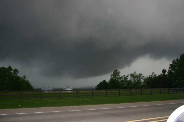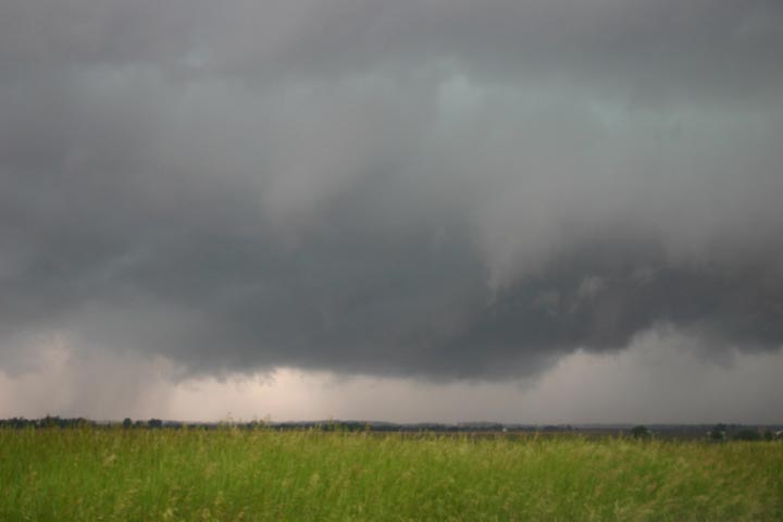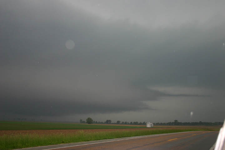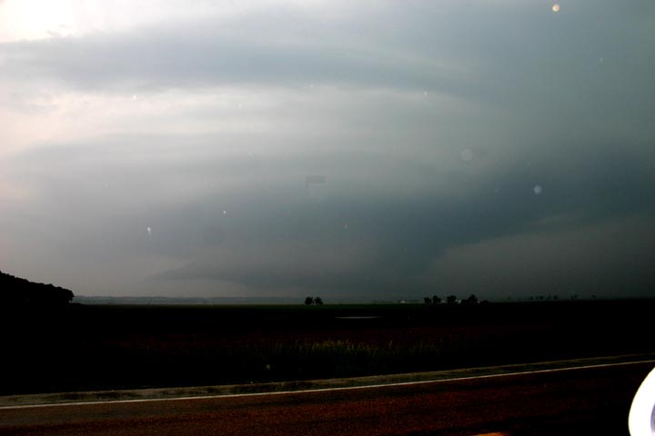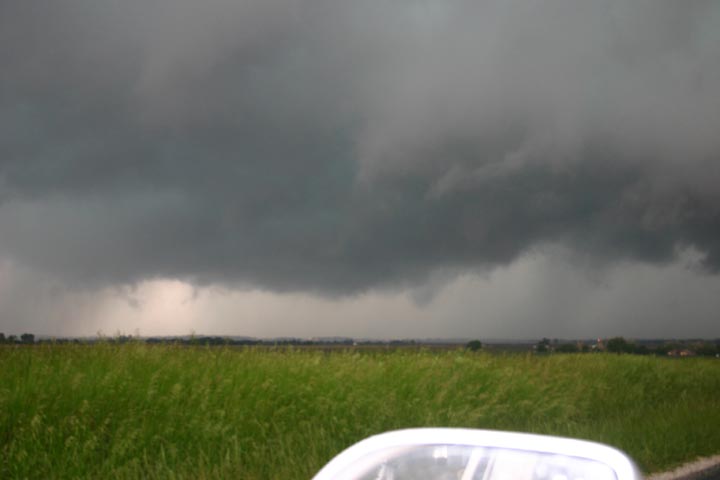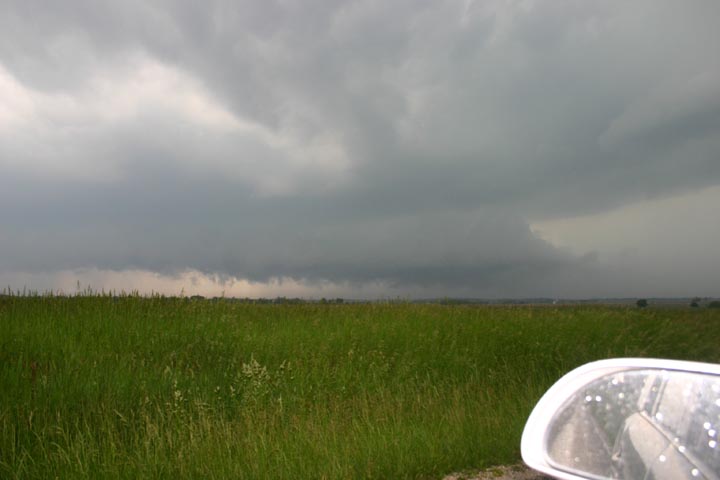 This picture was taken through the car window, as the CG lightning was getting pretty intense by now. As this wall cloud moved past to my north, I realized that was at least a couple miles across, if not more - one of the largest I have ever seen. I phoned the Lincoln NWS office to report a large, striated wall cloud, then headed east through Glasgow and beyond to try to keep up with the storm. The wall cloud persisted to my north as I blasted east to route 67, where I got momentarily confused by the way the road I was on merged into 67 - I was on the latter headed north before I realized it. This would not do, as I would drive into the storm if I kept going, so I stopped a couple miles north of Woodson. Around this time, the storm cycled, and what had been an RFD gust front/shelf cloud morphed into a new wall cloud: