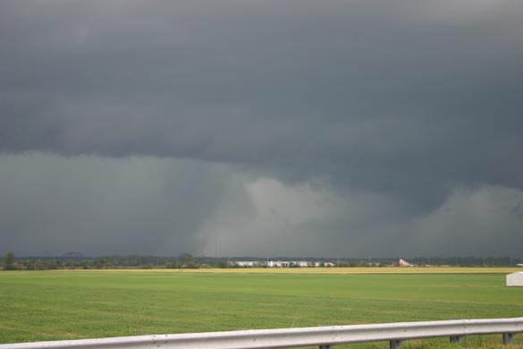 This picture was taken looking northwest from a couple miles east of Waterloo. Note what may be a funnel just to the right of the wall cloud - I couldn't tell, but in the enhanced version of this photo, it looks like it may have been:
