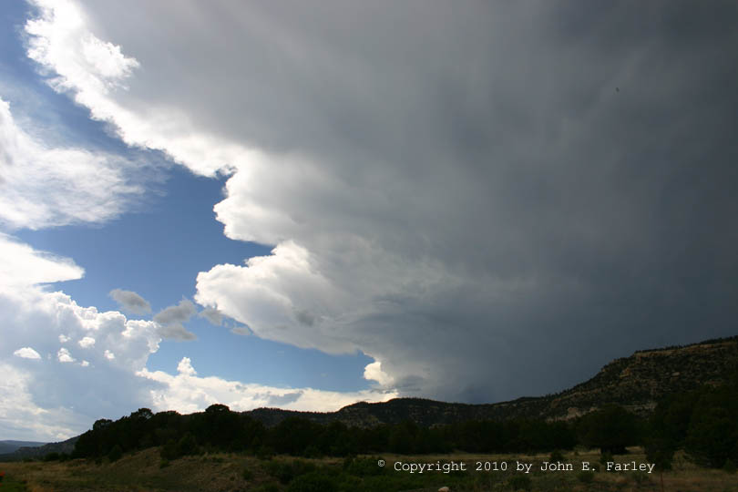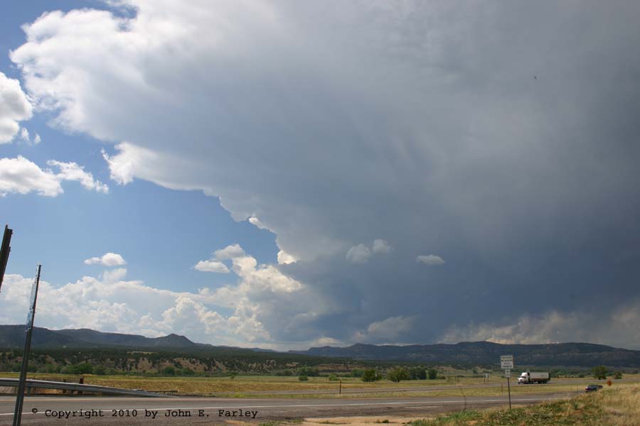I headed out from Santa Fe in the late morning and noticed storms already under way in the mountains between Santa Fe and Las Vegas, NM. Since the storms were in the mountains and the better severe weather setup was farther north, I continued up I-25 to the Raton, NM area. Along the way, I made various stops to for lunch, gas, and looking at storms over the mountains, such as this one. Like some of the others, this one had decent-looking upper structure, but relatively little precipitation. I liked the knuckled anvil in this particular cell. By the time I was getting into the Raton area around 3 or 3:30, a strong storm over the east slope of the mountains just north of the CO border northwest of Raton and southwest of Trinidad was getting my attention. To its south was another, weaker storm southwest of Raton, also over the east slopes of the mountains. I decided to drive up a wide canyon that extends more or less west from Raton to try to get closer to these storms and hopefully get a better view of the northern one through a gap in the mountains. As I did, I noticed that the southern storm had formed a small beavertail. Based on what happened later up in Raton Pass, I think now that this was an anticyclonic left split from the initial southern storm. Meanwhile, what I could see of the northern storm still looked pretty good. But what I could see of it was not a lot, so I decided to head up into Raton Pass to see if I could get a better look.