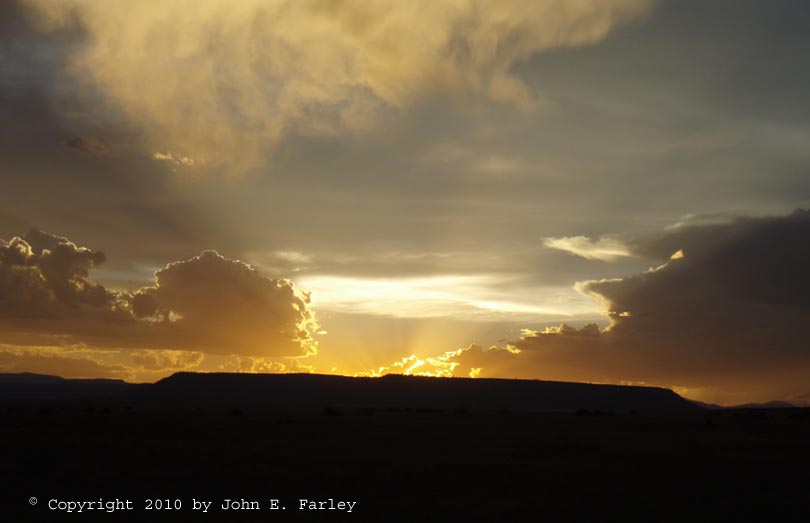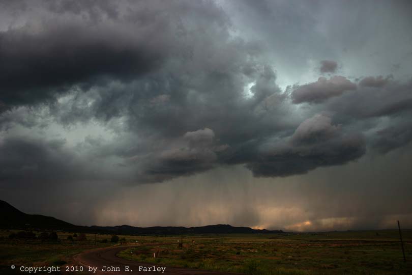 By now, though, the storms were weakening, so I knew it was time to head back to Santa Fe. I got a nice sunset view with some cumulus and a weak storm along the way. At this time, it appeared that all of the storms were weakening or dying out, though a few were still left in the southern Sangre de Cristo Mountains in the area between Santa Fe, Taos, and Las Vegas. With the storms weakening, I expected an uneventful drive back to Santa Fe.
