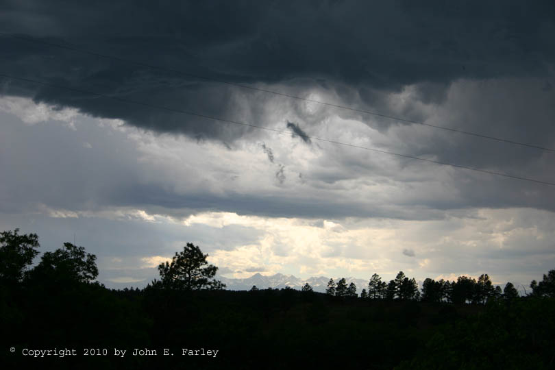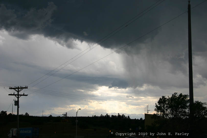 Around 20-30 minutes before this picture (actually a video capture, to show the lightning) was taken, this storm produced 1-inch hail to a depth of 4-6 inches just northwest of La Veta, CO; this picture was taken looking north along I-25 toward Walsenburg. La Veta is located 10 miles or so west of Walsenburg. In reviewing the radar, it appears that the storm that produced the large hail accumulation split, with one piece, perhaps driven by outflow (as opposed to a true anticyclonic split, although I was in the wrong place to tell which), moving east (what you see in the picture above), and the other piece staying to the west, over the east slopes of the mountains, and drifting only very slowly to the southeast. This right split was a continuation of the original supercell storm that formed just on the other side of the mountains near Great Sand Dunes National Park and drifted slowly southeastward. As I looked west toward the east slopes of the mountains, I saw this under the main updraft of the right split: