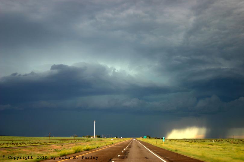 However, that was not quite to be the case. By the time I had passed Las Vegas, NM, I noticed a considerable increase in the lightning over the mountains, and the storms appeared to form a (perhaps-broken) line from somewhere down near Albuquerque to somewhere northwest of Las Vegas. Soon the lightning was near continuous, and it was evident I would need to cross through the line of storms. I did not have radar by now, because, when it earlier appeared the storms were dying out, I had disconnected and shut down the computer. Not sure I could have gotten a signal anyway. But by the time I was nearing the Pecos/Rowe exit, I could see an intense wall of precipitation ahead, illuminated by the frequent lighting. I was also driving in strong wind, with occasional clouds of dust being kicked up. Just before the exit, I was hit by an intense barrage of rain and hail, so I bailed off at the exit. The intense precipitation was blinding, and I could hardly see where I was going, but I knew there was an underpass where route 63 passed under I-25 at the north edge of Rowe. After a couple minutes I found it, and along with a few others took shelter from the hail under I-25 on the shoulder of route 63. The intense barrage of small (1/4-1/2 inch) hail continued for about 5 minutes and pretty much completely covered the road for a brief time. I got out of the car under the overpass and got some video. Would have gotten more if I had not had to dig out the video camera, which I had stashed in my tote when I had thought the chase was over. When the hail had stopped for a couple minutes, I started out, but it began to hail again, a little larger this time, so after turning around I got back under the overpass on the opposite shoulder. Again I got out and got video. The hail paused briefly, then resumed, but not as heavily as in the initial 5-minute barrage. However, the hail this time was a little larger, as noted above, with a few dime to penny sized stones. The video in the clip below is from the second wave of hail. After a couple minutes that stopped, and I proceeded on toward Santa Fe on I-25. A couple miles past the exit, I encountered an inch of so of hail accumulated on I-25, more than was left by then in the area where I had taken shelter. In the same general area, I also encountered one brief but very strong burst of wind. Around the time the hail began, the ABQ NWS had issued a significant weather advisory for the storm. Shortly after I got back on I-24, this was followed by a SVR warning for hail up to half-dollar sized and 60 mph wind, and the storm remained SVR warned for a couple hours as it surged southeast onto the plains, toward the Santa Rosa area.