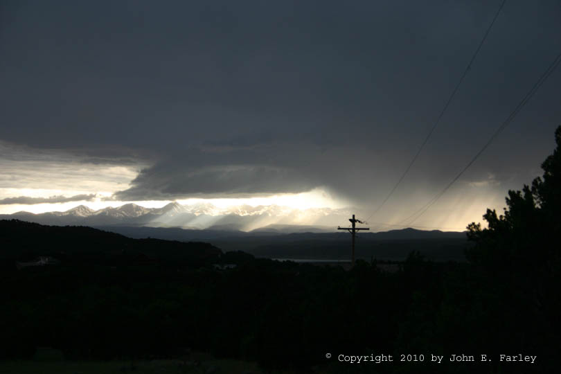 Soon, rain started falling, and the CG was getting very close. So, I retreated again, stopping one last time to look west from the south side of Trinidad at a new storm that had developed to the southwest of the one I had been watching. This one had crepuscular rays underneath it, and the combination of the storm, the crepuscular rays, and the Sangre de Cristo Mountains made for quite a view: