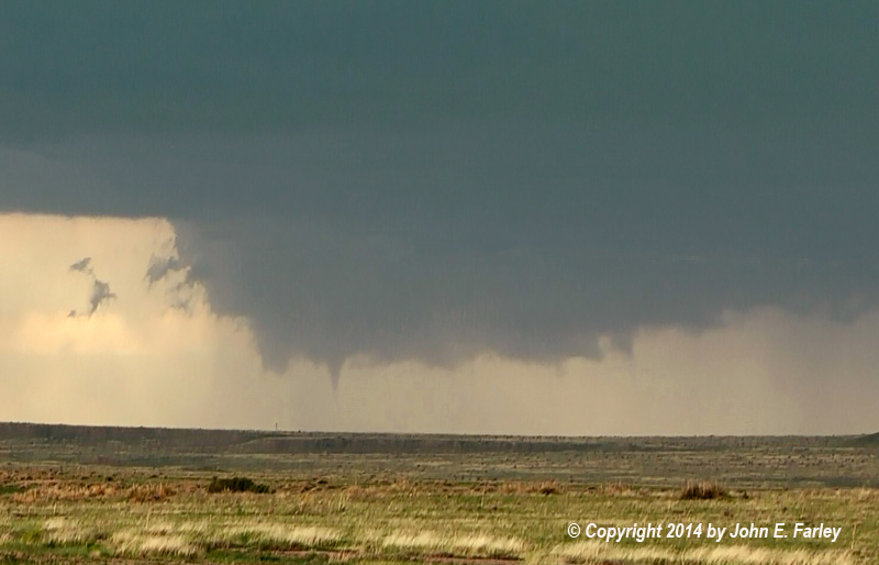 This formed under the new wall cloud, to the left of where the earlier tornado ended. The funnel was not fully condensed to the ground, but I could see what appeared to be dust rising under the funnel, so I was quite sure it was a tornado. Other chasers closer to it have confirmed that it was.