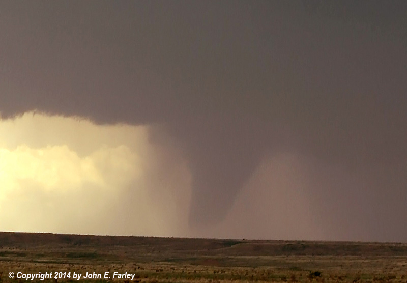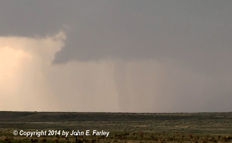 2:37: A large tornado is under way. This tornado is big but not fully condensed at this time, but it is clearly a tornado. There is much less dust than with the first one, as this tornado formed in a area where heavy rain had fallen from one of the previous day's supercells. (The first tornado had been in an area where little rain had fallen, so was much more dusty.) Here is a video capture of the tornado not long after it formed: