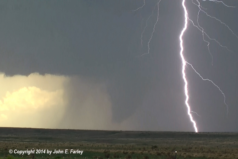 In the early stages of the tornado, there was a little rain between my location and the tornado. I was closer to this tornado than the first one, but still probably somewhere around 20-25 miles away. There was occasional CG lightning occurring in the rain, and when I reviewed my video I was able to get a great video capure of lightning with the tornado, which by now was gradually becoming more rain-wrapped, but was still clearly visible: