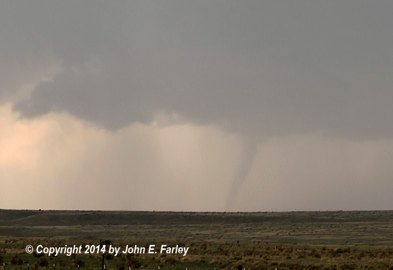 A few final thoughts: Although I knew the setup was good, I never really thought that I would see tornadoes as big and spectacular as these were. I do wish I had not gone so far east so I could have gotten back west in time to get a closer view of the tornadoes, but even from my distance they were quite photogenic, so no complaints! In fact, I would have to rate this as an all-time top five chase for me. I guess my only remaining question is whether I saw two tornadoes or three. My sense is that it is more likely three, but I may never know for sure. That also seems to be the dominant opinion among the relative handfull of chasers who were on this storm, several of whom were closer to the tornadoes than I was. After reviewing other chase reports and videos and discussion with some of the other chasers on the storm, my opinion is that there were two separate tornadoes associated with the second meso, so a total of three tornadoes for the storm. For now, NWS Pueblo is counting two and rated both of them high-end EF-1 based on damage to trees, fences, and powerlines. There was one minor injury from the first of the two large tornadoes, and route 160 was temporarily closed after the second one blew down power poles and lines across the road. When I passed that spot the next day, there were still power company crews working there, and it was interesting that the barb-wire fence along the road was plastered with tumbleweeds in the area where the tornado crossed the highway.