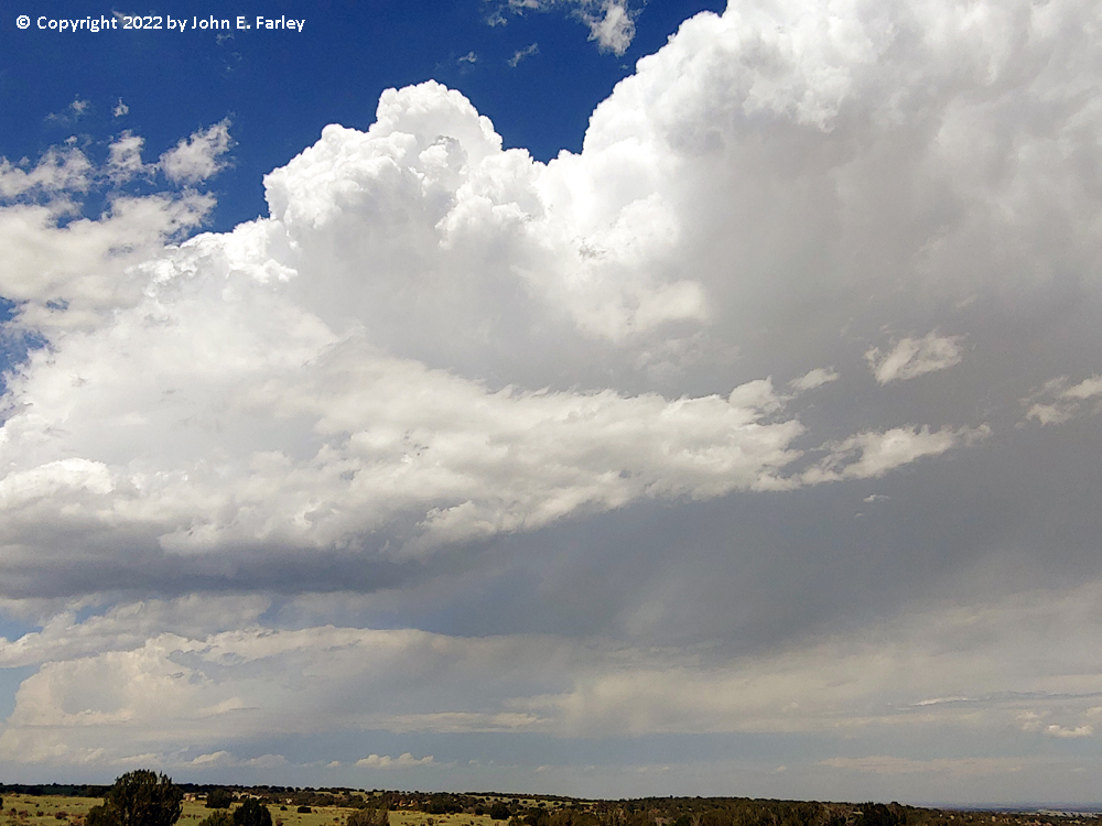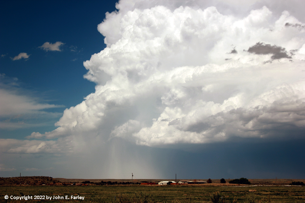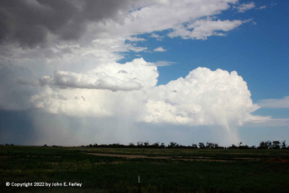2:00 - Heading NE toward La Junta from Walsenburg on CO route 10, I am monitoring the Colorado Springs storm and note another small one starting to go up just to my north. I know that as this storm matures it could also go severe, but I figured that 1) the Colorado Springs storm looked much more impressive and 2) the new storm, if it turned at all SE, would move into an area south of La Junta with almost no east-west roads to keep up with it. Hence, I headed north toward Fowler on CO route 167, passing east of the new storm. Once I was past it, I stopped briefly and noted that it had quite a bit of thunder for something that at the time looked like a very minor storm. Here is a picture I took as I was about to turn north and cross ahead of this new, small storm: