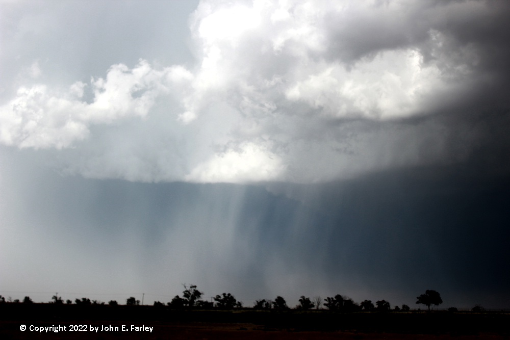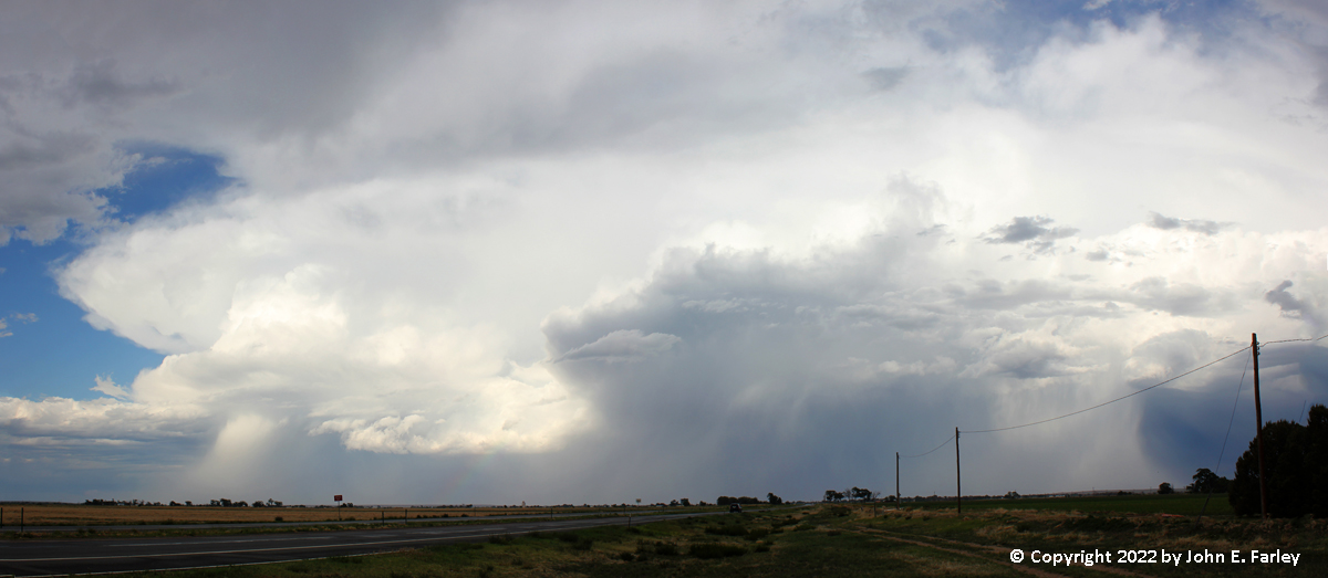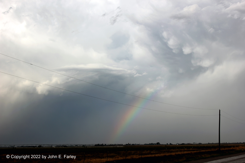 6:00 - 7:00 p.m. - I follow the storm along U.S. 50 from Rocky Ford to Lamar. It was evident there would be no getting south of it, but it offered me up sunlit rain and hail shafts, occasional lightning, and even sunlit mammatus with a rainbow as I followed the storm to Lamar.