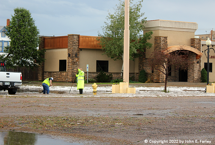 There were multiple areas like this in the downtown area on the west side of U.S. 287/385. And all over town, streets covered with leaves and twigs stripped from trees by the hail.