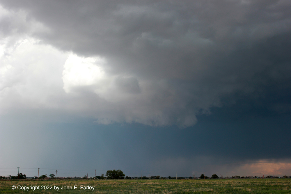 3:30-4:30 - I have the storm in my view the whole time as I head ESE, then ENE, along route 96 from Boone to Ordway. At times I can see the meso, its back side brightly lit by the sun shining into the storm's rear flank downdraft (RFD) slot: