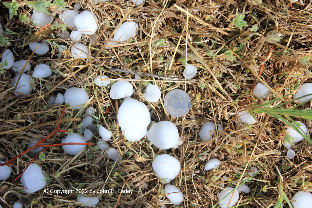 4:30-5:15 - As I arrive in Ordway, the emergency alert on my phone blares for a SVR warning with a DESTRUCTIVE tag for baseball hail and 60 mph wind, heading for Sugar City, which is 5 miles ENE of Ordway. The hail misses Ordway, but the wind doesn't, as RFD wind blasts the town and lofts dust - with sunshine and thunder. After the storm crosses 96 I head east through Sugar City to see if there are indeed baseball hailstones. Around 5 miles east of Sugar City there was lots of hail on the ground including quite a bit around quarter size and at least one that was 1.75" across at its widest point, considered golfball: